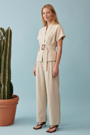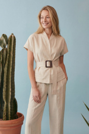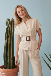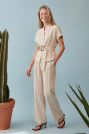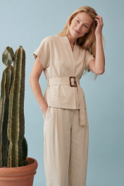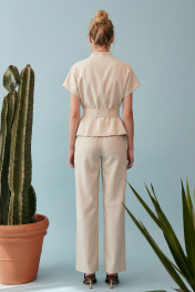 Жакет полуприлегающего силуэта на хлопковой подкладке выполнен изо льна. Модель отличается лаконичным кроем с мягкими, слегка спущенными плечами и коротким цельнокроеным рукавом, создающим плавную линию силуэта. Горловина оформлена в виде стойки с V-образным вырезом, без классического воротника, что придает образу современность и легкость. Скрытая центральная застежка на потайные кнопки, что усиливает чистоту дизайна. По переду по бокам в области бёдер не функциональные карманы- листочки. По спинке средний шов. Брюки прямого свободного силуэта, на притачном поясе, по спинке пояс на резинке. По переду брюк мягкие складки для дополнительного объема. В боковых швах карманы, застёжка на молнию, петлю и пуговицу. Основной акцент — широкий пояс из основной ткани с крупной геометричной пряжкой, который подчеркивает талию и формирует силуэт «песочные часы». Костюм выглядит современно и интеллектуально: минимализм форм сочетается с продуманной конструкцией. Натуральный оттенок и текстура ткани делают модель универсальной — она уместна как в дневных, так и в более формальных образах. Жилет: Длина по среднему шву спинки: 56 см ОГ: 90-94-98-102-106 см (размер 42-44-46-48-50) ОТ: 84-88-92-96-100 см (размер 42-44-46-48-50) ОБ: 94-98-102-106-110 см (размер 42-44-46-48-50) Длина плеча от шва притачивания стойки: 26 см Брюки: ОТ: 68-72-76-80-84 см (размер 42-44-46-48-50) ОБ: 102-106-110-114-118 см (размер 42-44-46-48-50) Длина с учетом пояса: 102,5 см
