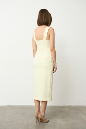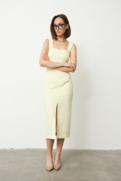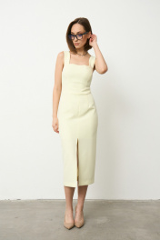 Платье миди прилегающего силуэта, отрезное по линии талии с глубоким разрезом по переду. Изделие выполнено из плательного крепа на подкладке. Застежка в среднем шве спинки на потайную молнию. Длина изделия по спинке 97 см.