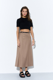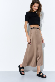 Юбка-миди трапецивидной формы из гладкой костюмной ткани с отстроченными кантами, имитирующими клинья. В боковых швах обработаны наклонные карманы. Пояс притачной со шлевками. Застежка на потайную тесьму-молнию в бокомом шве. Изделие без подкладки. Длина изделия 91 см.