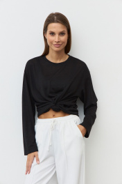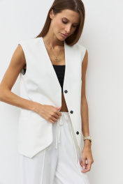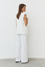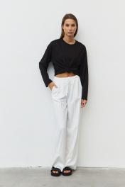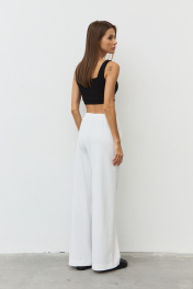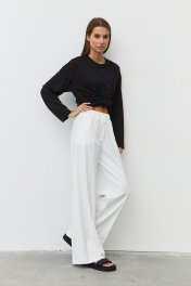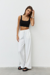 Широкие брюки из гладкой костюмной ткани с отстроченными стрелками по передним деталям. Пояс притачной с эластичной тесьмой и шнурком. В боковых швах обработаны наклонные карманы. Длина изделия по боковому шву 111 см. Длина изделия по шаговому шву 82 см.