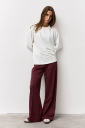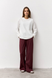Широкие брюки из гладкой костюмной ткани с отстроченными стрелками по передним деталям. Пояс притачной с эластичной тесьмой и шнурком. В боковых швах обработаны наклонные карманы. Длина изделия по боковому шву 111 см. Длина изделия по шаговому шву 82 см.