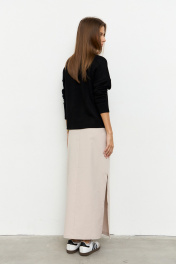 Юбка прямого силуэта из джинса средней плотности с высокими разрезами в боковых швах. Передняя часть юбки с вытачками и центральным швом, в котором обработана застежка на тесьму-молнию. Спинка со средним швом и вытачками. В боковых швах обработаны наклонные карманы. Пояс притачной со шлевками и застежкой на пуговицу. Длина изделия 103 см.