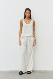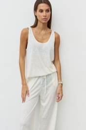 Уютный костюм из вискозного полупрозрачного трикотажного полотна состоящий из майки и брюк. Майка из вискозного полупрозрачного трикотажного полотна с глубокой горловиной. Спинка и полочка разной длины с закругленными краями. Длина изделия от плечевой точки 63/67 см. Брюки свободного кроя. Пояс с эластичной тесьмой и шнурком. В боковых швах обработаны карманы. Длина изделия по боковому шву 110 см. Длина изделия по шаговому шву 80 см.