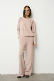 Теплый трикотажный костюм в рубчик состоящий из джемпера и брюк. Брюки прямого силэта на притачном поясе с резинкой. В боковых швах обработаны наклонные карманы. Длина изделия по боковому шву 108 см. Длина изделия по шаговому шву 80 см. Джемпер прямого силуэта с круглой горловиной и рукавами - реглан. В боковых швах разрезы. Спинка длиннее переда на 2 см по боковому шву. Длина изделия по спинке 69 см. Длина рукава 71-73 см.