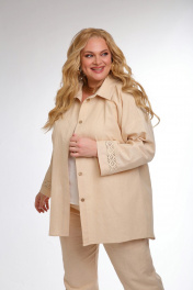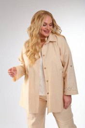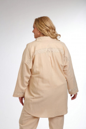 Рубашка прямого кроя с отложным воротником на стойке. Застежка центральная на петли пуговицы. Рукав свободного кроя с декоративной вставкой из хлопкового кружева. По спинке декоративная вставка кружева. Длина рубашки по спинке от горловины – 85см. Длина рукава от края горловины – 70см.