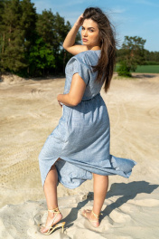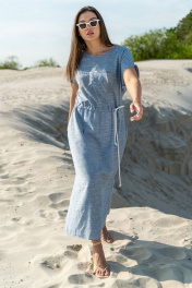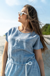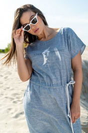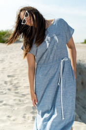 Платье актуального кроя со спущенной линией плеча из натуральной ткани. По переду-печать,по бокам разрезы, в боковых швах-карманы. По талии кулиса с декоративным шнурком-поясом.