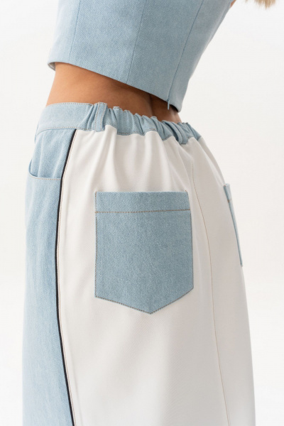 Юбка прямого силуэта из джинса и плотного трикотажного полотн, зауженная к низу на притачном поясе на резинке. По переду -разрез,с накладными карманами по заднему полотнищу юбки, декоративной нашивкой и декоративным кантом по боковому шву. В дополнении к юбке-пояс с декоративной пряжкой. длина-90 см