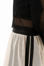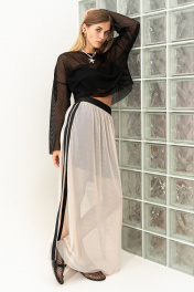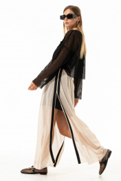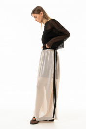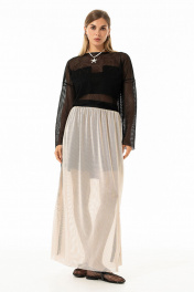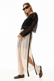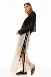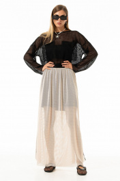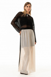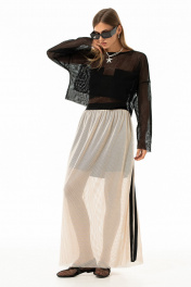 Юбка на резинке из сетки, прямого силуэта с высокими разрезами в боковых швах, вдоль разрезов -отделочная тесьма, нижняя короткая юбка из вискозы. длина-98см