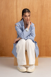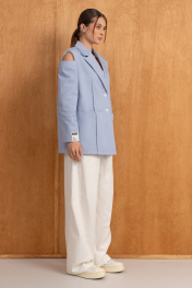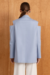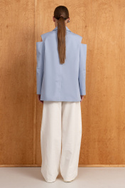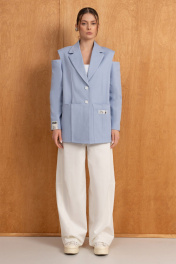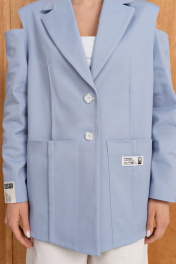 Удлинённый жакет оверсайз из хлопка в трендовом голубом цвете на подкладке, свободного кроя прямого силуэта с расширенной линией плеч, с центральной застёжкой на две петли-пуговицы,с накладными карманами.По спинке-шлица.Интересный частично открытый рукав придаёт образу романтизм.Он отлично подойдёт для вечеринки в клуб,на корпоратив,а в дополнении с аксессуарами и кроссовками можно создать кэжуал образ для повседневных будней.Особое внимание уделяем качеству пошива,продуманным деталям и комфорту.