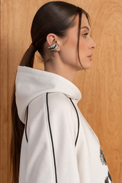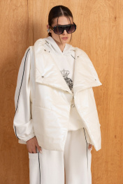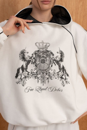 Женский комплект(жилет,свитшот и брюки).Жилет женский на синтепоне на подкладке со смещённой застёжкой на кнопки,воротником-стойкой и карманами.Свитшот прямого силуэта с двойным капюшоном,рукавами-реглан,по низу резинка с фиксатором-регулировать можно объём.Брюки высокой посадки на резинке,по низу-резинка с фиксатором,благодаря чему форму брюк по низу можно менять.Вертикальные швы, контрасные канты , принт на свитшоте и отделка в капюшоне добавляют образу изюминку.