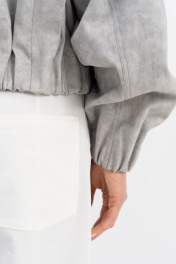Тренч укороченный на подкладке,актуального свободного кроя,прямого силуэта,с небольшим оверсайзом, с центральной двубортной застёжкой на петли-пуговицы.Благодаря стильному фасону можно создавать множество образов от делового до кэжуал стиля.По переду карманы с клапанами,рукава и низ на широкой резинке.