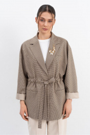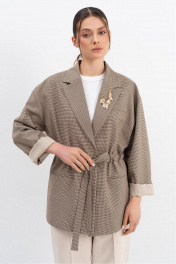 Элегантный жакет из костюмной ткани,свободного кроя прямого силуэта со спущенной линией плеча с застёжкой на кулису и поясом.На лацкане декоративная брошь.Свободный крой жакета не сковывает движения,карманы в рамку для практичности и удобства. Жакет подходит для офисных будней,вечерних прогулок.