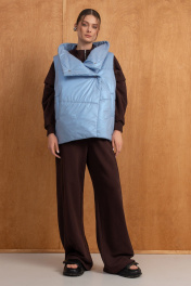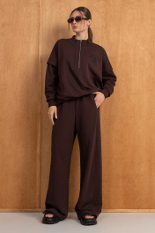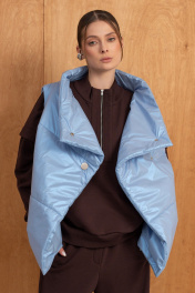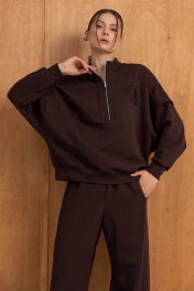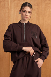 Костюм тройка(жилет,свитшот и брюки).Жилет женский на синтепоне на подкладке со смещённой застёжкой на кнопки,воротником-стойкой и карманами.Свитшот интересного свободного кроя,со спущенной линией плеча,молнией и воротником-стойкой.Воротник,манжеты по рукавам и низ изделия выполнен из ткани-компаньона"рибана".Брюки прямого силуэта с высокой посадкой на резинке,вертикальными швами,в одном из которых-карман,по спинке накладкой карман с металлической нашивкой.Детали костюма сочетают практичность,а декор в виде печати на свитшоте задают ему стиль. РАЗМЕРЫ 46 48 50 52 СВИТШОТ Ширина по линии талии, см. 66 68 70 72 Ширина по линии бедер,см 54 56 58 60 Длина изделия, см. (по спинке) 64 64 64 64 Длина рукава от точки плеча см. 62.5 62.5 62.5 62.5 Ширина рукава, см. 27 29 31 33 РАЗМЕРЫ 46 48 50 52 БРЮКИ Ширина по линии талии, см. 38 40 42 44 Ширина по линии бедер, см. 58.5 60.5 62.5 64.5 Длина изделия, см.(сбоку) 112 112 112 112 РАЗМЕРЫ 46 48 50 52 ЖИЛЕТ Ширина по линии груди, см. 62.5 64 66 68 Ширина по линии талии, см. 62.5 64 66 68 Ширина по линии бедер,см 62.5 64 66 68 Длина изделия, см. (по спинке) 67 67 67 67