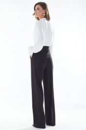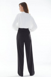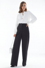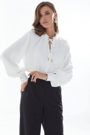 Блузка прямого силуэта. Воротник - стойка, декорирован изящными складками, по переду с V-образным вырезом и завязками. По переду блузки центральным шов. Рукав "реглан" длинный, на манжете с застежкой на петли и пуговицы. Длина блузки: 64см Длина рукава: 52см от горловины