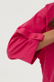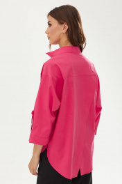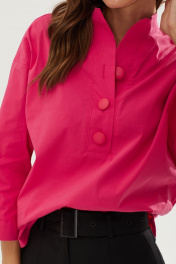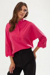 Стильная блузка из хлопковой ткани свободного силуэта с фигурным низом. Воротник - стойка. Перед блузки с притачной планкой с застежкой на петли и пуговицы. Спинка с кокеткой, нашивной декоративной пластинкой и диагональным срезом, переходящим в разрез понизу. Рукав реглан длиной 3/4, с притачной манжетой с декоративной патой и пуговицами понизу. Длина изделия: 72см Длина рукава: 59см