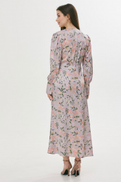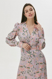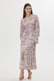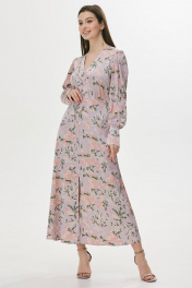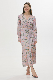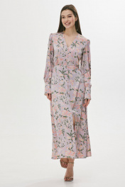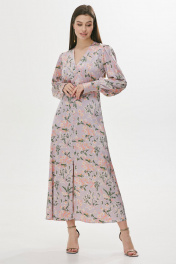 Стильное платье полуприлегающего силуэта расширенное книзу из струящейся ткани. Горловина V-образная. Платье отрезное выше лини талии. По переду шов с разрезом и декоративными пуговицами. По переду в области груди и на спинке сборка. Рукав втачной длинный, по низу манжета с застежкой на петли у пуговицы. Обращаем ваше внимание, что фурнитура может незначительно отличаться от фото. Длина платья: 130 см Длина рукава: 64 см