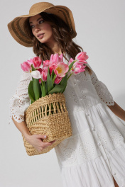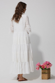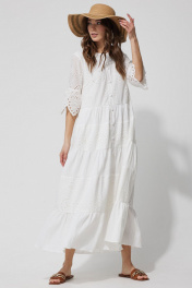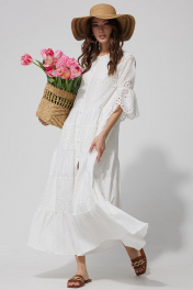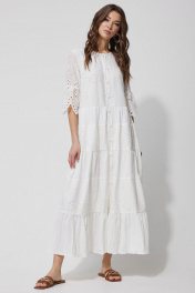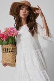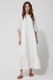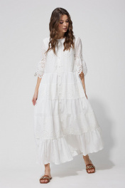 Платье А – силуэта из однотона со вставками из ришелье. Горловина округлая. По переду застежка на петли и пуговицы. Рукав втачной, по низу волан со сборкой от подреза. Платье отрезное по линии талии. По низу платья воланы со сборкой. Платье на подкладке.