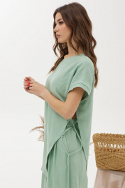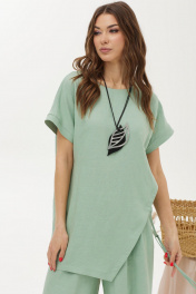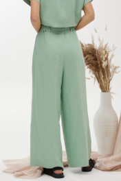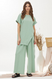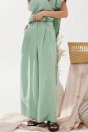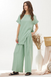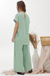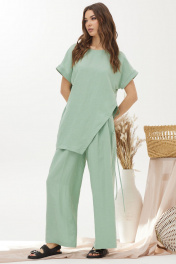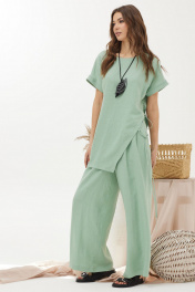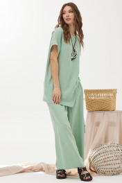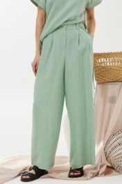 Оригинальный комплект, состоящий из блузки и брюк. Ассиметричная блузка прямого силуэта из льняной ткани с добавлением из вискозы. Горловина округлая, на спинке застежка на петлю и пуговицу. Рукав цельнокроеный, по низу манжета. Левый боковой шов ассиметричный с декоративными завязками. Изделие дополнено кулоном. Брюки прямого силуэта из льняной ткани с добавлением вискозы. По верху брюк притачной пояс с застежкой на петлю и пуговицу и шлевками для ремня. На передних половинках обработаны наклонные карманы, декоративные складки и застежка молния в среднем шве. В брюки на поясе на уровне боковых швов вставлена эластичная тесьма (резинка). На спинке вытачки. Обращаем ваше внимание, что фурнитура может незначительно отличаться от фото.