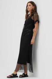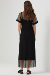 Платье силуэта трапеция из трикотажной сетки, комбинированной однотонным трикотажем. Воротник стояче-отложной с застежкой на молнию по центру. Рукав цельнокроеный, по низу притачная манжета. По низу в боковых швах длинные разрезы. В комплект входит нижнее платье на бретелях полуприлегающего силуэта с дизайнерской печатью. Длина верхнего платья: 137см Длина нижнего изделия : с бретелью 122см Длина рукава от горловины: (44-48р – 29см); (50-54р – 32см)