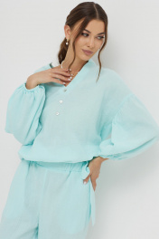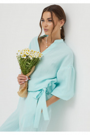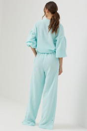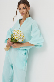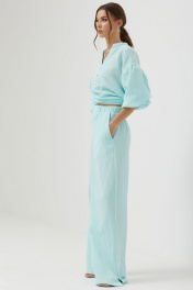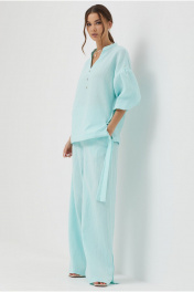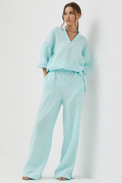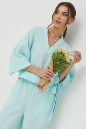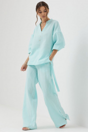 Костюм выполен из ткани "муслин", освежающего, мятного цвета, состоящий из блузы и брюк. Муслин – воздухопроницаемый материал, в котором не жарко даже при максимальных температурах. Нежный, мягкий материал, не доставляет неудобств в процессе носки. Блуза с v-образным вырезом, и воротником с отложной стойкой. По низу блузы расположена кулиска. Пройма спущенная, с втачным рукавом, с эластичной тесьмой (резинкой) по низу. Брюки прямого силуэта. По верху брюк притачной пояс на резинке. На передних половинках обработаны наклонные карманы. Внизу декоративные шлицы, с застежкой на петли и пуговицы. Обращаем ваше внимание, что фурнитура может незначительно отличаться от фото. Длина блузы (в 44-48 р. - 60 см) (в 50-54 р. - 63 см) Длина брюк (в 44-48 р. – 104см+4 см пояс) (в 50-54 р. – 105 см+4 см пояс) Длина рукава от горловины: (в 44-48 р. - 64 см) (в 50-54 р. - 65 см).