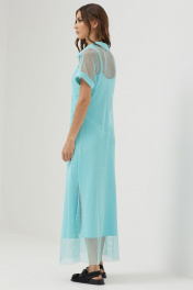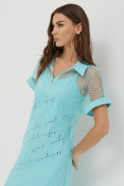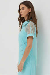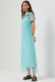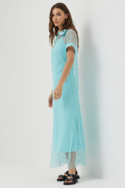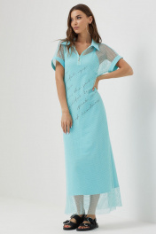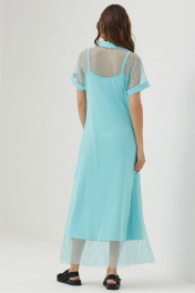 Платье силуэта трапеция из трикотажной сетки, комбинированной однотонным трикотажем. Воротник стояче-отложной с застежкой на молнию по центру. Рукав цельнокроеный, по низу притачная манжета. По низу в боковых швах длинные разрезы. В комплект входит нижнее платье на бретелях полуприлегающего силуэта с дизайнерской печатью. Длина верхнего платья: 137см Длина нижнего изделия : с бретелью 122см Длина рукава от горловины: (44-48р – 29см); (50-54р – 32см)