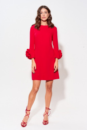 Нарядное платье полуприлегающего силуэта из струящейся ткани с акцентными рукавами. Горловина округлая, по спинке в центральном шве застежка на потайную молнию. Рукав втачной длиной 7/8 , по низу декоративный элемент из основной ткани. По переду нагрудные вытачки, на спинке - талиевые. Длина платья (44-48р - 86см)(50-54р - 91см) Длина рукава 48см