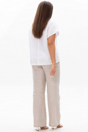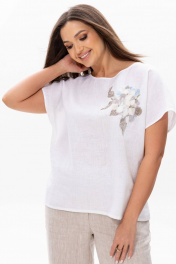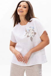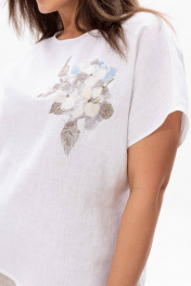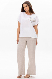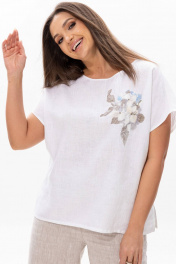 Женская льняная блуза Ma Сhérie свободного силуэта. Вырез округлый. На полочке расположена дизайнерская вышивка. Рукав короткий со спущеной линией плеча. Спинка с центральным швом, в боковых швах разрезы. Длина изделия 59 см, длина рукава от горловины 30 см. Рубашка для торжественных мероприятий и повседневных образов, будет идеально смотреться с нашими брюками 2054 (на фото), также обе модели можно приобрести комплектом 3068.