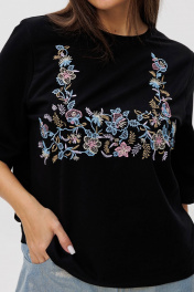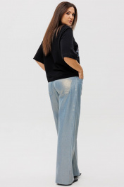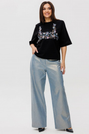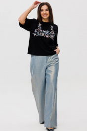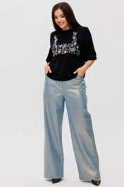 Стильный двухпредметный комплект Ma Сhérie, состоящий из трикотажного джемпера и широких джинсовых брюк с эффектом блеска. Джемпер свободного силуэта. Горловина округлая, обработана обтачкой. Полочка цельная, на груди оригинальная дизайнерская вышивка. Спинка цельная. Рукав по локоть, одношовный втачной. Длина изделия 61-62,5 см в зависимости от размера, длина рукава 34 см. Брюки-палаццо. Пояс притачной со шлевками, застежка на молнию с гульфиком и петлю-пуговицу. Передние половинки цельные, в боковых швах функциональные карманы с диагональным входом. Задние половинки цельные с накладными карманами. Длина по боковому шву 114-115 см в зависимости от размера. Комплект можно одеть как на торжественное мероприятие, вечеринку, полойдет и для повседневного использования. Джемпер и брюки можно приобрести раздельно. Модели 1133 и 2080 соответственно.