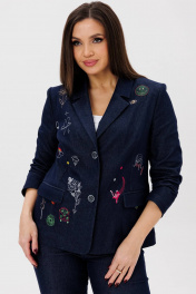 Стильный джинсовый костюм Ma Сhérie, состоящий из жакета и брюк. . Жакет полуприлегающего силуэта. Воротник пиджачного типа, застежка центральная однобортная на две петли и пуговицы. Полочка с талиевыми вытачками и функциональными карманами ""в рамку"" с клапаном. На полочке расположена дизайнерская вышивка. Спинка с рельефами. Рукав втачной двухшовный. Низ борта закругленной формы. Жакет без подкладки. Длина изделия 65-67 см в зависимости от размера. Длина рукава 62,5-63 см в зависимости от размера. Брюки длиной 7/8. Пояс притачной, застежка на молнию с гульфиком и петлю-пуговицу. Спереди и сзади функциональные карманы. Длина изделия по шаговому шву 66 см., по боковому шву 98-99,5 см в зависимости от размера. Идеальный стильный образ для прогулки на свежем воздухе с друзьями. Жакет и брюки можно приобрести раздельно. Модели 1145 и 2084 соответственно.