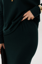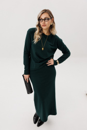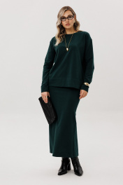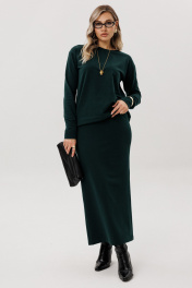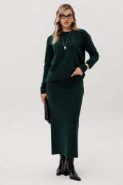 Костюм двухпредметный, состоит из джемпера и юбки. Джемпер свободного кроя с длинным рукавом. Юбка прямого силуэта с разрезом по центру задней половинки. Разрез усилен тесьмой. По линии талии эластичная тесьма.