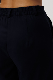 Кюлоты прямого силуэта с запахом по передне половинке. В боковых швах карманы. Застежка на потайную тесьму-молнию по боковому шву. Линия талии регулируется по спинке резинкой