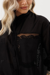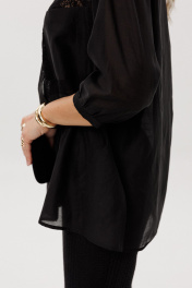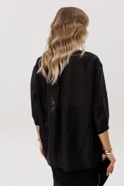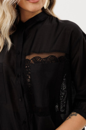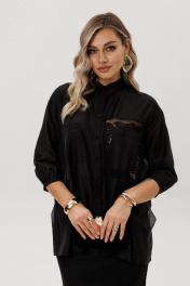 Блуза свободного кроя со спущенным плечом, двумя накладными карманми на полочке. Карман на левой полочке настрочен на декоративную кружевную вставку. Рукав 3/4 с узкими манжетами . Воротник -стойка.