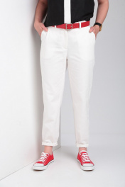 Брюки из джинсовой ткани свободного кроя зауженные к низу. В боковых швах карманы в отрезном бочке. На задней половинке накладные карманы и отрезная кокетка. По низу брюк притачные манжеты. Длина брюк 90 см.