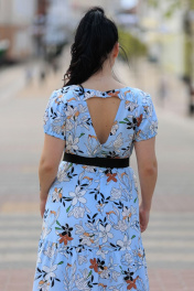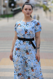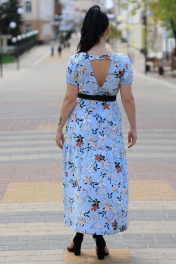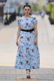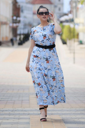 Платье женское на подкладке,вырез горловины круглый,по груди декоративная планка с пуговками. По талии резинка,на спинке V образный вырез с застежкой на пуговку. Рукав фонарик на резиночке. В комплекте пояс. Длина изделия 131 см,длина рукава 17,5 см