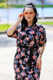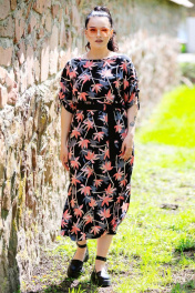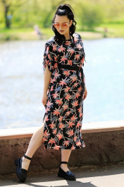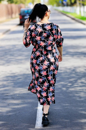 Платье прямого силуэта,рукав спущеный(затягивается на завязку).По спинке вырез и резинка. Спереди декоративный пояс,по бокам платья разрезы. Длина изделия 128см.