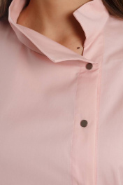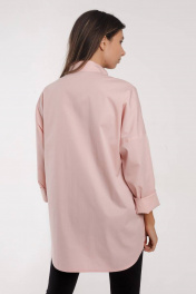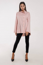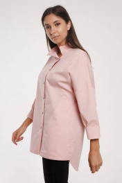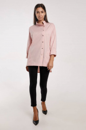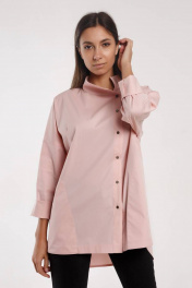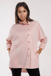 Стильная однотонная удлиненная асимметричная женская блузка-рубашка прямого силуэта, с большими фигурными накладными карманами и смещённой застёжкой на 6 кнопок, из плотной платьево-блузочной ткани "шуршун". По переду нагрудные вытачки от бокового шва и два накладных кармана входящих в вытачки и боковые швы. Карман настрочен по овальному контуру и низу. Спинка цельная, удлинённая, округлой формы. Рукава длинные, рубашечные одношовные. Низ рукава обработан швом с закрытым срезом. По горловине воротник-стойка асимметричной формы. Длина по спинке 44 и 46 размеров 77,5 см, длина по спинке 48, 50 и 52 размеров 80 см. Для высоких, для невысоких. Школа, офис, работа, деловой стиль, для школьниц, для студентов, для учителей, для прогулок, уютная и комфортная.