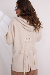 Стильный и комфортный комплект из блузы и брюк. Выполнен из поливискозной , приятной к телу ткани с легким эффектом жатки. Блуза прямого свободного рубашечного кроя с капюшоном и центральной застежкой на пришивные пуговицы. Капюшон дополнен декоративным шнуром с красивыми бусинами. Рукав втачной, линия плеча спущена. Для регулировки длины по низу рукав дополнен патой с пуговицей. Брюки свободного кроя с притачным поясом, дополненным эластичной тесьмой с застежкой гульфик на молнию и пуговицу. По низу брюки присборены эластичной тесьмой. Брюки дополнены удобными боковыми карманами. Длина блузы от плечевого шва 72см. Длина рукава 55см. Длина брюк по боковому шву 96см.