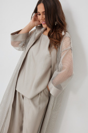 Стильный комплект из длинного кардигана, топа и брюк. Кардиган свободного прямого кроя с разрезами. Выполнен из текстильной сетки с отделкой из гладкой костюмной ткани. Рукав втачной, слегка спущен. Дополнен съемным поясом. Топ и брюки выполнены из красивой костюмной гладкой ткани. Топ свободного прямого кроя. Горловина округлой формы. Брюки классического прямого кроя. Посадка средняя. Пояс притачной, дополнен эластичной тесьмой. Брюки дополнены удобными боковыми и задними карманами. Застежка гульфик на молнию и пуговицу. Длина кардигана от плечевого шва 136см. Длина рукава 47см. Длина топа от плечевого шва 67см. Длина брюк по боковому шву 107см.