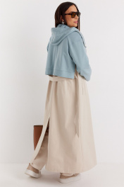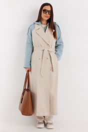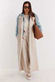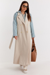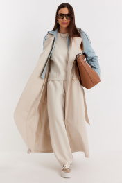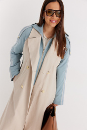 Невероятно стильный двубортный тренч классического свободного кроя, на подкладке. Рукава и отлетная спинка выполнены из комфортного трикотажного футера. Тренч дополнен съемной манишкой с капюшоном, выполненной из того же трикотажного футера. Центральная застежка на пришивные пуговицы. Притален за счет съемного пояса, выполненного из основной ткани. По бокам расположены удобные карманы. Длина тренча от плечевого шва 133см. Длина рукава 60 см.
