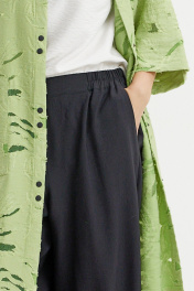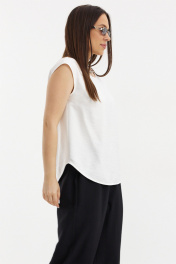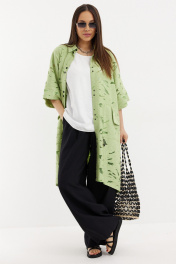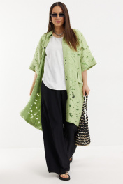 Стильный и элегантный образ из кардигана, топа и брюк. Кардиган свободного рубашечного кроя с центральной застежкой на металлические кнопки. По спинке дополнен кулиской с декоративной тесьмой. Кардиган дополнен удобными карманами. Топ свободного прямого кроя с округлой горловиной и коротким рукавом. Брюки свободного прямого кроя с притачным поясом, дополненным эластичной тесьмой. Длина кардигана от плечевого шва по переду 98см., по спинке 111см. Длина рукава 35см. Длина топа 66см. Длина брюк по боковому шву 103см.