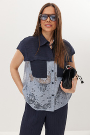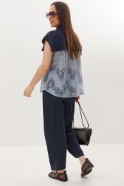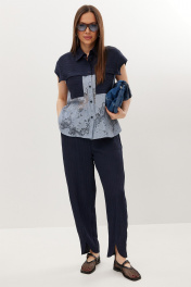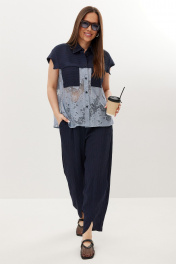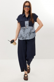 Стильный образ из блузы и брюк. Блуза свободного рубашечного кроя с центральной застежкой на пуговицы. Выполнена из двух видов ткани: натуральной фактурной ткани и нежного кружева. Брюки свободного кроя с притачным поясом, дополненным эластичной тесьмой. Посадка средняя. По спинке красивая кокетка. Брюки слегка заужены книзу с красивым вырезом. Удобные боковые карманы добавляют комфорта. Длина блузы от плечевого шва 65см. Длина рукава 14см. Длина брюк по боковому шву 97см.
