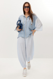 Стильный летний комплект из блузы и брюк, выполненный из ажурного трикотажного полотна в сочетании с легкой однотонной тканью. Блуза свободного кроя с центральной застежкой на молнию. Горловина обработана капюшоном. Блуза с удлиненной спинкой. Легкие и дышащие брюки-алладины свободного объемного кроя выполнены из ажурного трикотажного полотна. Дополнены притачным поясом с эластичной тесьмой. Удобные боковые карманы придают еще большего комфорта. Брюки имеют подкладку-шортики телесного цвета. Длина блузы по переду 70см, по спинке 86см. Длина рукава 35см. Длина брюк по боковому шву 96см.