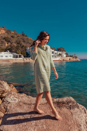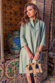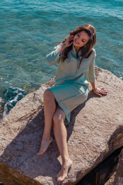 Платье зауженное к низу с декоративными швами и карманами в рельефах. Воротник-стойка с планкой. Рукав спущенный с имитацией манжеты.