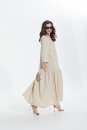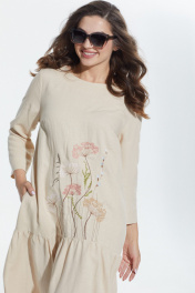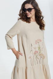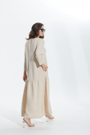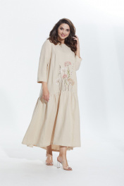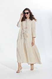 Платье в стиле оверсайз. Горловина округлой формы, слегка расширена. Платье с подрезом ниже линии бедер, нижняя часть со сборкой по кругу. Перед с нагрудными вытачками от боковых швов и вышивкой от подреза. В боковых швах карманы. Верхняя часть спинки со средним швом, вверху которого разрез, застегивающийся на 2 навесные петли и пуговицы. Рукав втачной одношовный, длиной 3/4.