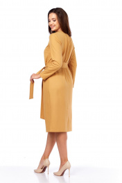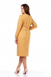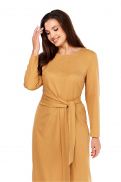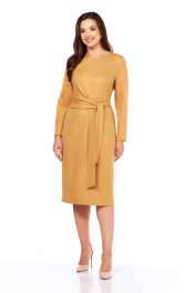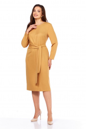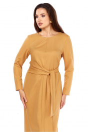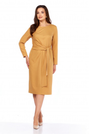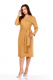 Платье полуприлегающего силуэта, слегка зауженное к низу. Спинка со средним швом и шлицей. Горловина округлой формы, по спинке с застёжкой на пуговицу и навесную петлю. Рукав длинный втачной. По переду средний шов, нагрудные вытачки, на уровне талии декоративные складки, переходящие в пояс.
