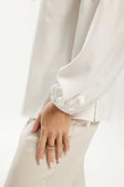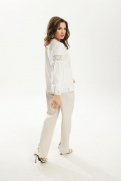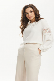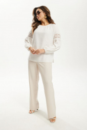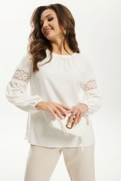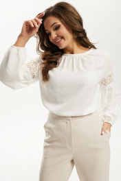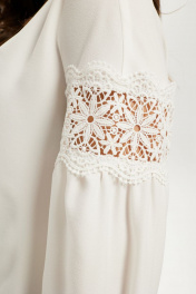 Блузка женская без застежки. Горловина округлой формы, обработана бейкой из основной ткани. По переду у горловины декоративная сборка. Рукав расширенный на резинке по низу. По верху рукава вставка из плетеного кружева. В боковых швах по низу разрезы.