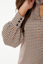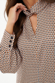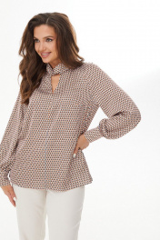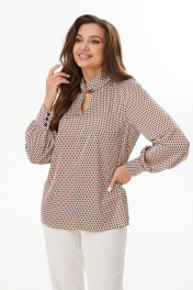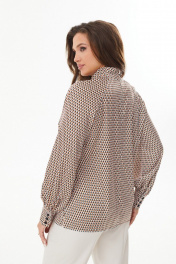 Нарядная блузка из атласной ткани. На полочке небольшой V-образный вырез и декоративная стойка. Спинка со средним швом и застежкой на молнию. В боковых швах по низу разрезы
