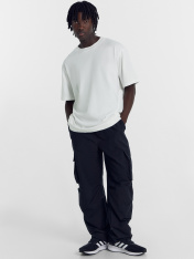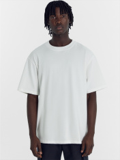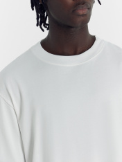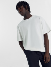 Футболка мужская из кулирного полотна. Силуэт прямой, свободный. Длина до середины бедер. Спинка и перед цельнокроенные. Круглая горловина, плотно прилегающая к шее, обработана притачной обтачкой из рибаны, шов соединения расстрочен Линия плеча немного спущена. Рукава короткие, втачные. Нижние срезы футболки и рукавов обработаны швом в подгибку на плоскошовной машине.