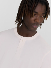 Поло мужское из кулирного полотна , 100% хлопок 180 г/м2. Силуэт прямой. Длина до середины бедер. Спинка и перед цельнокроенные. По переду обработана застежка «поло» на 2 петли и пуговицы (d=10мм). Отрезная воротник-стойка из рибаны. Боковой срез планки и верхний срез воротника-стойки обработан на оверлоке. Рукава короткие, втачные.По плечевым швам и окату рукава отделочные строчки. Нижние срезы рукавов и изделия обработаны швом вподгибку на плоскошовной машине.