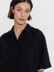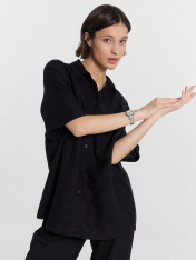 Женская рубашка свободного силуэта выполнена из нежного сочетания вискозы и натурального льна, что придает ей особые преимущества. Вискоза обеспечивает мягкость и приятное ощущение на коже, а также обладает отличной воздухопроницаемостью, что помогает поддерживать комфортную температуру тела. Натуральный лён, в свою очередь, добавляет прочности и долговечности изделию, а также обладает гипоаллергенными свойствами. Модель оснащена застежкой на пуговицы и накладным карманом слева на груди. Короткие рукава со спущенной линией плеча и свободный крой придают этой рубашке стильный и современный вид, делая её отличным выбором для повседневного гардероба.